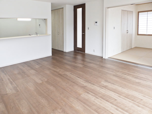 リビング横の和室はベージュの琉球畳にお花柄のクロスを合わせてモダンでおしゃれな空間に