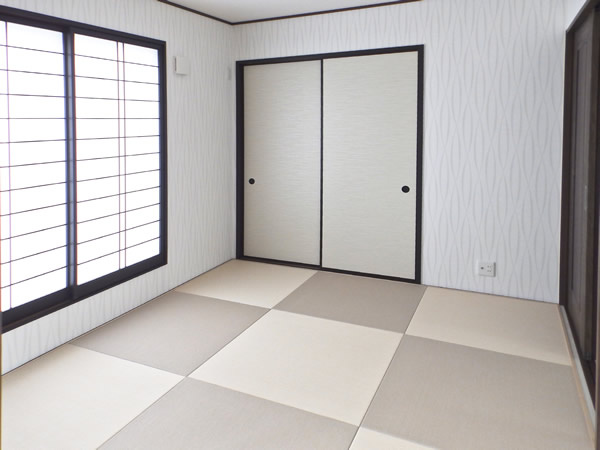 リビング横の和室はベージュとブラウンの琉球畳に流線を描くクロスを合わせてモダンに仕上げました。