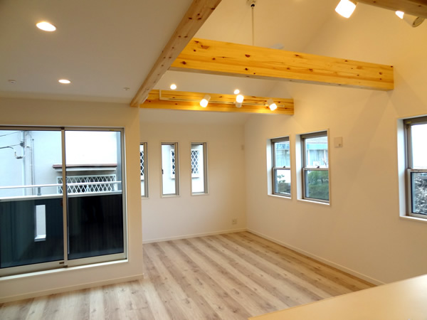 2階にリビングを配置することにより、梁むき出しの勾配天井に。ロフトも設けて大変開放感があります。