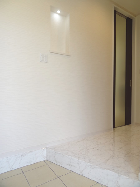 所沢市牛沼 K様邸のご紹介 施工事例 2016.04.24 桜並木沿いに建つ住宅 春には家の中からお花見玄関周りにアクセントの外壁を採用。玄関を開ければ、大理石調の廊下がお出迎えします。キッチンはタカラ製。吊戸棚下には水切りラックを付けました。随所にこだわりのアクセントクロスを貼りました。 next 所沢市和ケ原 T様邸のご紹介です 2016.05.05