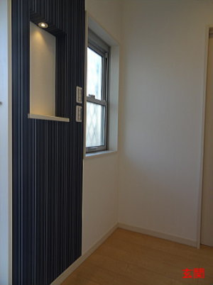 収納スペース満載の玄関は、ワンポイントに色違いのクロスを貼ってお洒落に決めました。