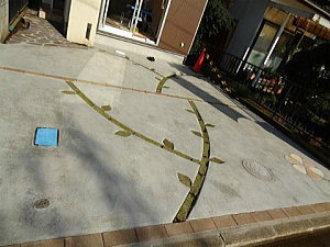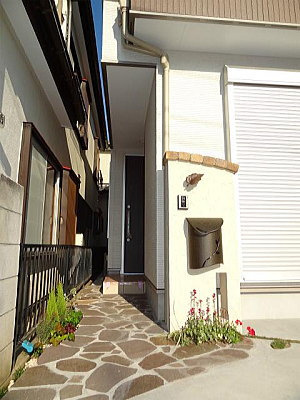 花と緑をモチーフに作られた駐車スペースから続く玄関へのアプローチは、おしゃれな石畳。