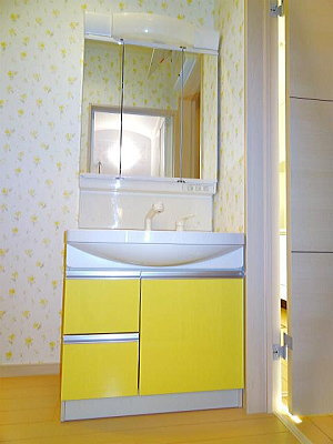 室内も、ライトグリーンのキッチンや、イエローで統一された洗面室、プラチナリーフのパネルでお風呂にも緑が配置され、ポップでキュートな邸宅が出来上がりました。