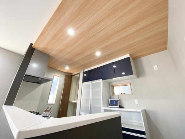 お客様からのご要望として、室内を見渡すことができるキッチンと、リビングでもちょっと座ってくつろぐことが出来る畳コーナーを設けております。